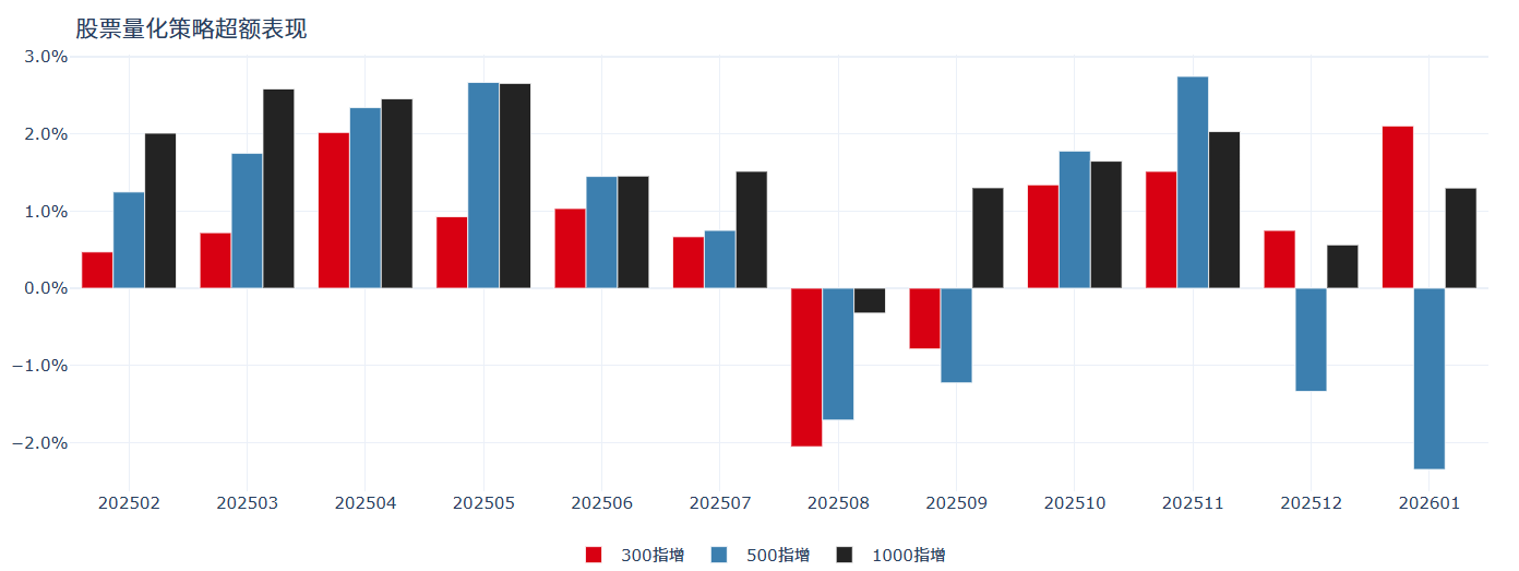 股票量化策略在1月觸底反彈,市場(chǎng)在12月初形成了新一輪的抱團(tuán)行情,成交集中于中大盤權(quán)重股,指增尤其是500指增的超額持續(xù)回撤,月中隨著市場(chǎng)降溫及貴金屬的回調(diào),個(gè)股相對(duì)指數(shù)的強(qiáng)弱迎來(lái)一定修復(fù),部分風(fēng)格重回長(zhǎng)期方向上,超額尤其是中低頻策略迎來(lái)反彈,alpha環(huán)境中性偏弱。