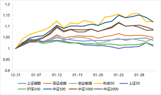 1月A股市場(chǎng)整體呈現(xiàn)震蕩上行趨勢(shì)。月初延續(xù)強(qiáng)勢(shì)上證走出17連陽(yáng),市場(chǎng)對(duì)經(jīng)濟(jì)復(fù)蘇改善、政策紅利持續(xù)釋放及資金面充裕的預(yù)期未變。中旬隨著監(jiān)管政策降溫,融資保證金比例上調(diào),市場(chǎng)進(jìn)入高位震蕩調(diào)整期,前期高位題材迎來(lái)回調(diào),資金轉(zhuǎn)向硬科技與資源板塊。風(fēng)格上,科創(chuàng)領(lǐng)漲,紅利弱勢(shì);中證500受益于電子、有色金屬等板塊的強(qiáng)勢(shì),大幅跑贏其他寬基指數(shù),其次是中證1000和中證2000等小盤寬基,中盤 > 小盤 > 大盤,滬深300、上證50漲幅不足2%。