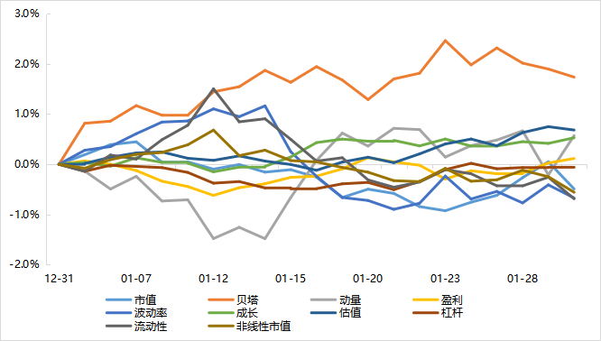 1月,市場(chǎng)在上半月和下半月呈現(xiàn)截然相反的行情,上半月科技帶頭,高波以及高流動(dòng)性風(fēng)格顯著,而在市場(chǎng)降溫后,波動(dòng)率和流動(dòng)性風(fēng)格驟然反轉(zhuǎn),盈利、估值等基本面風(fēng)格同步回歸。全月來(lái)看,小盤股強(qiáng)于大盤股,動(dòng)量風(fēng)格顯著,下半月低波、低流動(dòng)性的反轉(zhuǎn)力度較強(qiáng),全月波動(dòng)率下跌0.67%,流動(dòng)性風(fēng)格下跌0.69%,利好中頻量?jī)r(jià)及基本面策略,偏高頻的alpha策略在上半月表現(xiàn)突出,下半月弱于中低頻,風(fēng)格端環(huán)境中性偏好。
