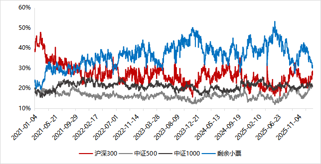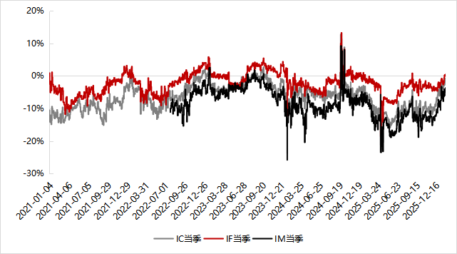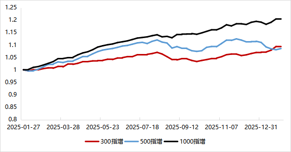 股指基差自25年12月初持續(xù)收斂至今,IF當(dāng)季目前處于升水狀態(tài),IC的季月年化基差由月初的6.1%降至1.4%,IM季月年化基差由月初的9.5%降至3.7%,單月收斂幅度較大,在1月為中性貢獻(xiàn)了顯著的負(fù)收益,對(duì)未建倉(cāng)的中性而言,當(dāng)前是一個(gè)較好的建倉(cāng)時(shí)點(diǎn)。