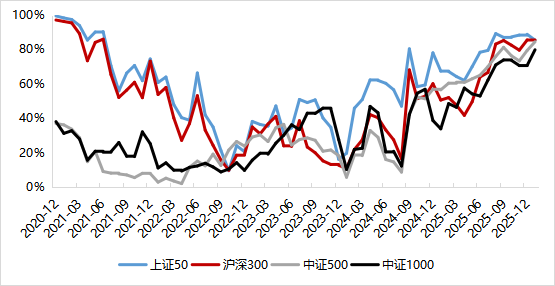 以中證500為代表計(jì)算的股債收益差近期位于歷史滾動(dòng)均值附近,自2025年9月后圍繞均值小幅震蕩,寬基指數(shù)相對(duì)債券的配置性價(jià)比處于中等水平。