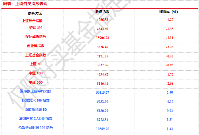 上周,歐美主要市場(chǎng)漲跌不一,其中,道指上漲2.50%,標(biāo)普500下跌0.10%;道瓊斯歐洲50 上漲0.92%。亞太主要市場(chǎng)漲跌不一,其中,恒生指數(shù)下跌3.02%,日經(jīng)225指數(shù)上漲1.75%。